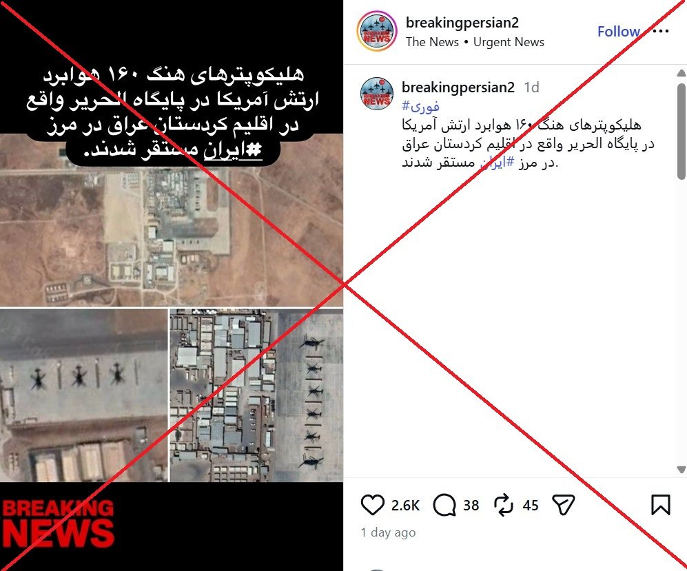 بنابراین، حتی اگر خبرهایی درباره انتقال نیرو و تجهیزات به پایگاه هوایی الحریر در اقلیم کردستان درست باشد، این موضوع به تنهایی ادعای منتشر شده در شبکههای اجتماعی درباره «تصاویر ماهوارهای از بالگردهای هنگ ۱۶۰» یا «استقرار دلتا فورس در نزدیکی مرز ایران» و اساسا ارتباط آن با تحولات ایران را تایید نمیکند؛ به ویژه که تصاویر مورد استناد، قدیمی هستند و منابع معتبر و رسمی نیز درباره یگانهای خاص یا برنامه عملیاتی علیه ایران منتشر نکردهاند.