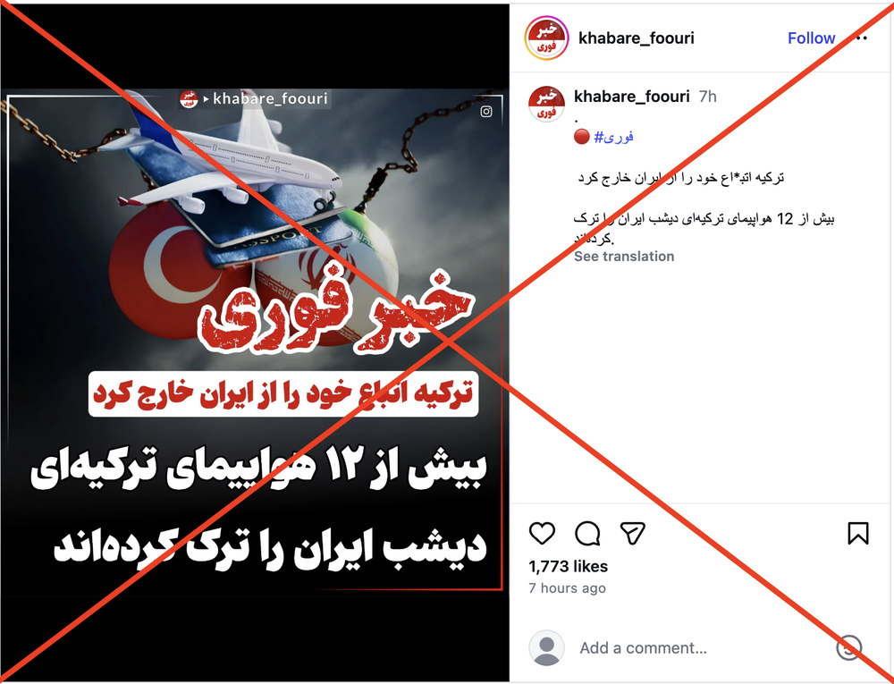 خبری به طور گسترده در اینستاگرام منتشر شده (لینک ۱، لینک ۲، لینک ۳) که ادعا میکند ترکیه اتباع خود را از ایران خارج کرده و مدعی است که «شب گذشته بیش از ۱۲ هواپیمای ترکیهای ایران را ترک کردند.»