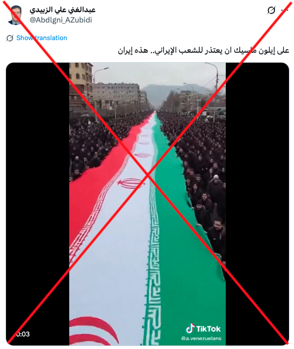 چهارم، عدم تایید مستقل: با وجود پوشش وسیع راهپیمایی حامیان حکومت در تلویزیون جمهوری اسلامی ایران در ۲۲ دی ۱۴۰۴، هیچ گزارش رسانهای از داخل از چنین تجمعی با پرچم طولانی در خیابان سخن نگفته. تجمعات واقعی حامی دولت گزارش شده، اما بدون این نمایش خاص.
