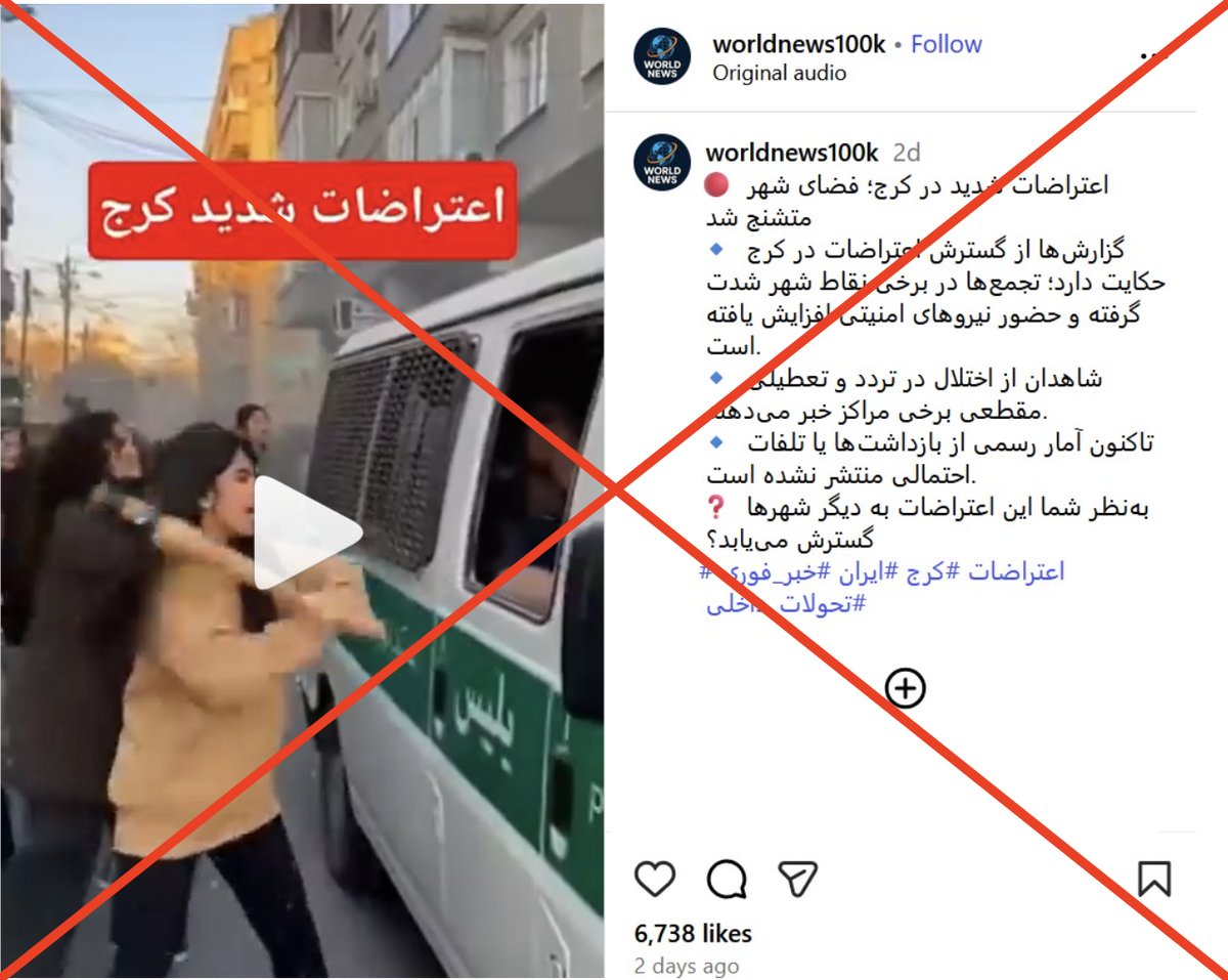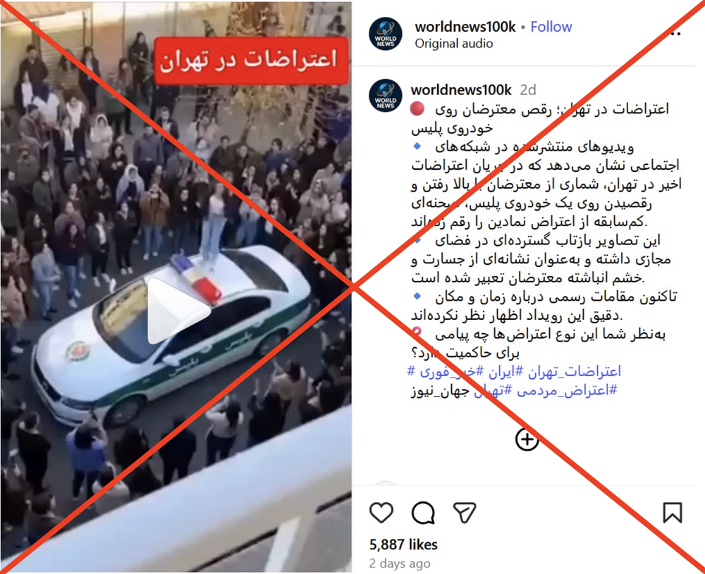 در یک مطلب دیگر که ادعا میشود مربوط به اعتراضات در تهران است، دختری روی سقف یک ماشین نیروی انتظامی میرقصد. این خودرو شباهتی به هیچکدام از مدلهای اتومبیل نیروهای انتظامی در ایران ندارد. چراغ گردان آن، آبی و قرمز است که مربوط به خودروهای پلیس راهور محسوب میشود اما بدنه آن سفید و سبز است؛ یعنی رنگ خودروهای پلیس کلانتری. شواهد تصویری آشکار دیگری هم وجود دارد که ساختگی بودن ویدیو را تایید میکند.