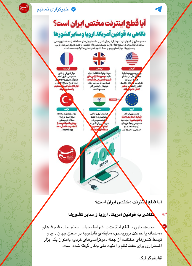 پس از خاموشی سراسری اینترنت و قطع ارتباطات در دی ۱۴۰۴، خبرگزاری تسنیم، با انتشار یک تصویر اینفوگرافیک با عنوان «آیا قطع اینترنت مختص ایران است؟» مدعی شد: