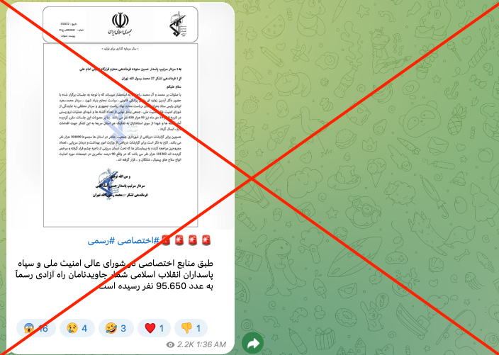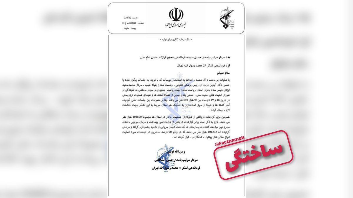 از روز گذشته تعدادی از حسابهای کاربری در شبکههای اجتماعی تصویر نامهای منتسب به سپاه پاسداران منتشر کردهاند که در آن نوشته شده «تعداد کشتهها و شهدای عملیات تروریستی در تاریخ ۱۸ و ۱۹ دی ماه، ۹۵ هزار و ۶۵۰ نفر میباشد.»