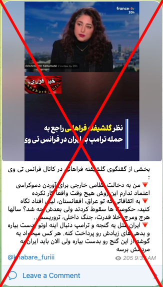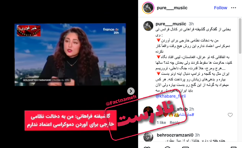 برخی از سایتهای خبری در ایران و همچنین حسابهای کاربری مانند سپاه سایبری پاسداران ادعا میکنند گلشیفته فراهانی، بازیگر ایرانی، در مصاحبه با «تلویزیون فرانسه» گفته است به دخالت خارجی برای آوردن دموکراسی اعتماد ندارد و به وضعیت چند کشور از جمله عراق، افغانستان و لیبی اشاره کرده و گفته است بعد از حمله آمریکا، در این کشورها هرج و مرج به وجود آمده است.