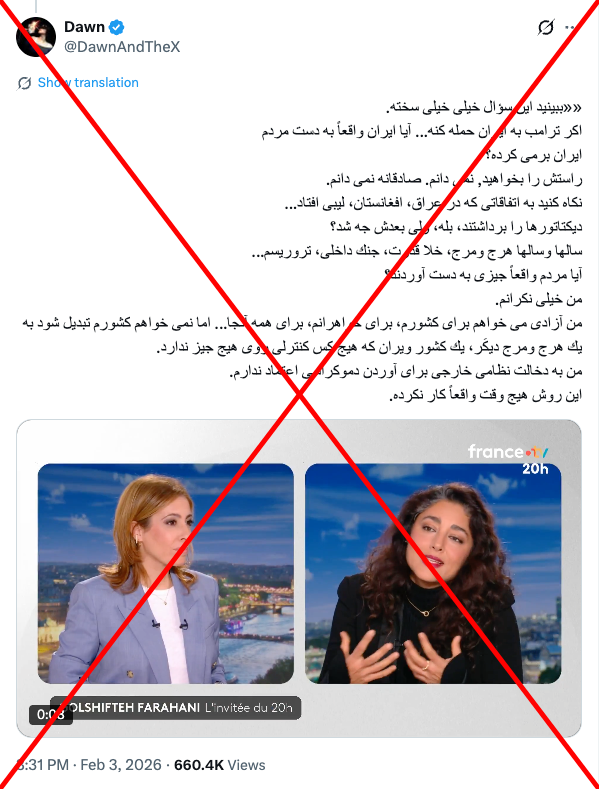 گلشیفته فراهانی روز دوم فوریه ۲۰۲۶ در بخش خبری ساعت ۲۰ تلویزیون فرانسه، به سوالاتی درباره وضعیت اعتراضها در ایران پاسخ داد.