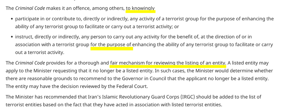 قانون کیفری مکانیزم کاملاً دقیق و منصفانهای برای بازنگری فهرست نهادها فراهم میکند. یک نهاد فهرستشده میتواند به وزیر درخواست دهد که دیگر به عنوان نهاد فهرستشده محسوب نشود. در چنین مواردی، وزیر بررسی میکند که آیا دلایل منطقی برای توصیه به فرماندار در شورای دولت مبنی بر حذف آن نهاد از فهرست وجود دارد یا خیر. تصمیم وزیر میتواند توسط دادگاه فدرال بازبینی شود.
