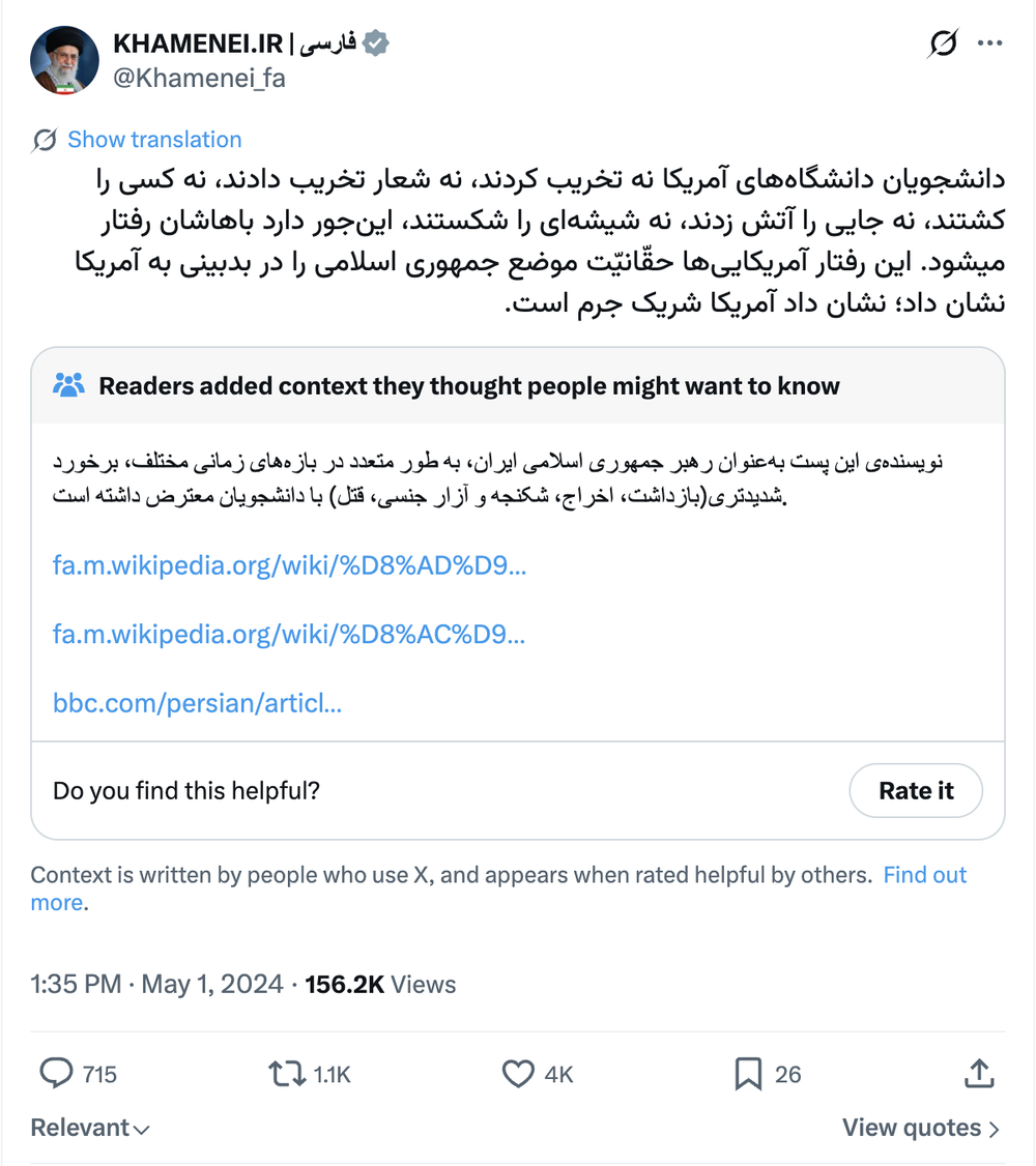 پلتفرم X برای اولین بار و بهطور رسمی زیر پستهای علی خامنهای برچسبهای Community Notes اضافه کرده است.