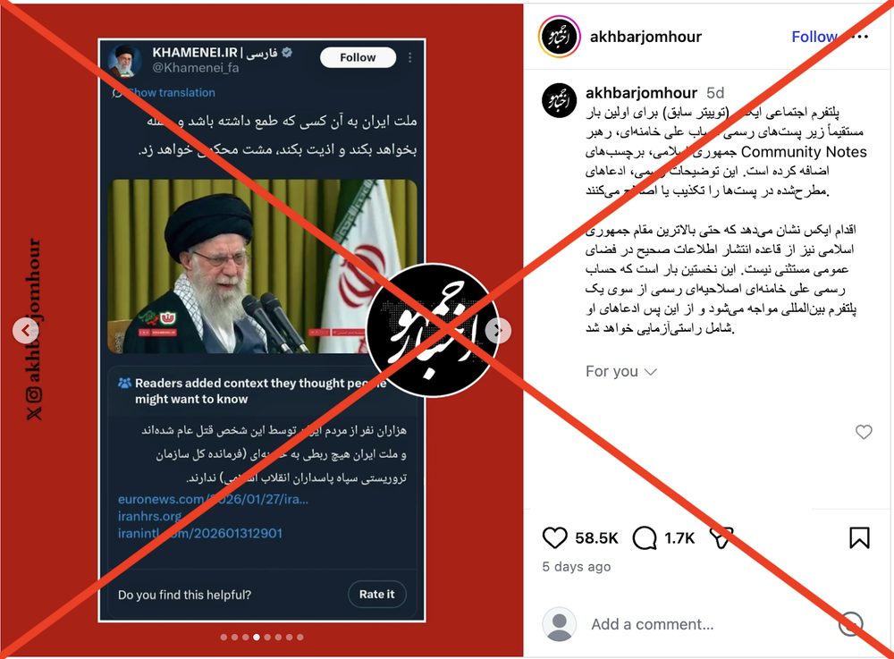 از این رو این ادعا که پلتفرم X برای اولین بار و بهطور رسمی، برچسبهای Community Notes را مستقیماً زیر پستهای علی خامنهای اضافه کرده و این نتها اصلاحیه رسمی این پلتفرم محسوب میشوند، «نادرست» است.