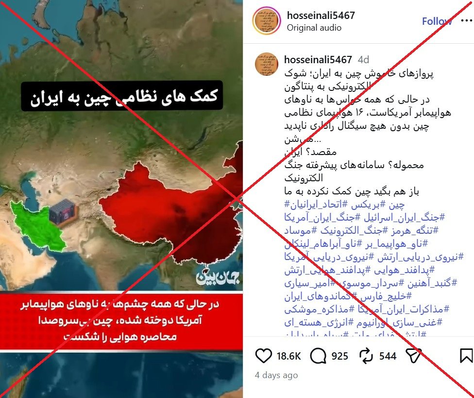 ادعایی در شبکههای اجتماعی منتشر شده که میگوید با افزایش تنش نظامی بین ایران و آمریکا، چین با ارسال ۱۶ هواپیمای ترابری به جمهوری اسلامی ایران ابزار جنگ الکترونیک داده است. (لینک۱ ، لینک۲ ، لینک۳ ، لینک۴ ، لینک۵ ، لینک۶ ، لینک۷ ، لینک۸ ، لینک۹)