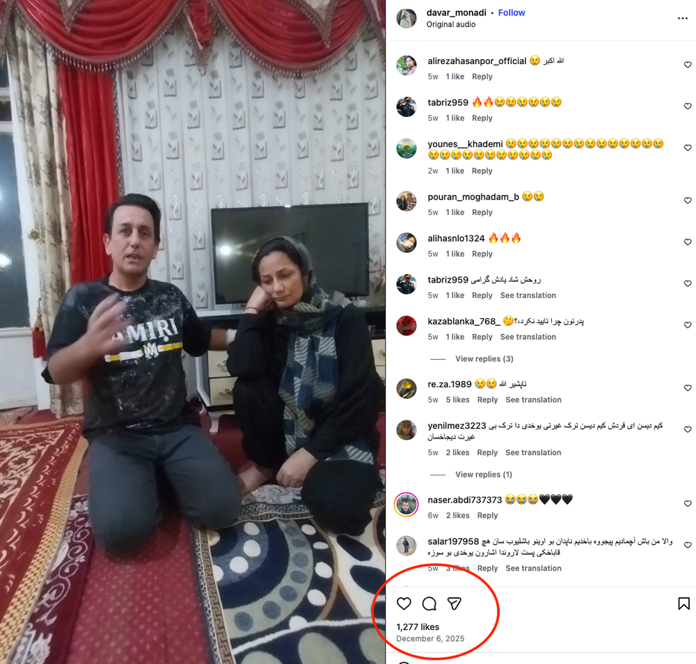 حساب اینستاگرام داور منادی که به نظر میرسد پدر پریا منادی باشد، ششم دسامبر ۲۰۲۵ ( ۱۵ آذر ۱۴۰۴) یعنی پیش از شروع اعتراضات، این ویدیو و چند ویدیوی دیگر را در توضیح رفتاری که با آنها در دادگستری شده به اشتراک گذاشت.