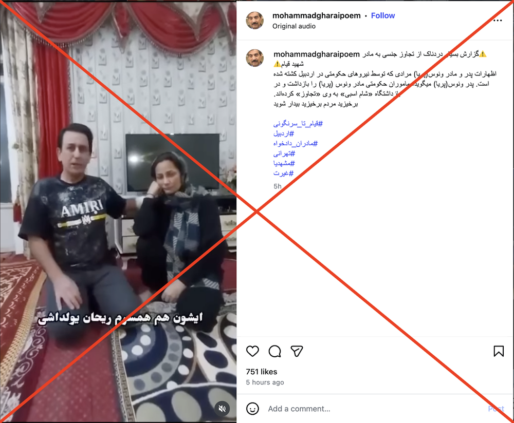 در ساعتهای گذشته ویدیویی به طور گسترده در صفحات اینستاگرام دست به دست میشود که در آن ادعا میشود مربوط به مادر و پدری است که فرزند خود را در کشتار دی ماه از دست دادهاند و زمانی که مادر برای دادخواهی به دادگستری مراجعه میکند به او تجاوز میشود. (لینک ۱، لینک ۲، لینک ۳، لینک ۴، لینک ۵)