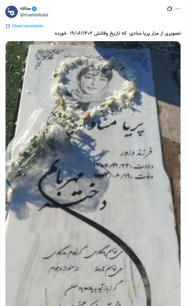 حساب کاربری «مملکته» در شبکه ایکس عکسی از سنگ قبر ونوس مرادی منتشر کرده که نشان میدهد تاریخ وفات او نوزدهم شهریور ۱۴۰۲ است. مقایسه سنگ قبر منتشر شده در «مملکته» و سنگ قبرهایی که در اینستاگرام داور منادی منتشر شده، ثابت میکند سنگ قبرها یکی است و تشابه اسمی نیست.