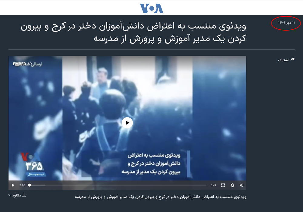یازدهم مهر ۱۴۰۱، صدای آمریکا این ویدیو را که در شبکههای مجازی منتشر شده بود، بازنشر کرد و نوشت که منتسب به دانشآموزان مدرسهای در گوهردشت کرج است که مسئول آموزش و پرورش را از مدرسه بیرون میکنند.