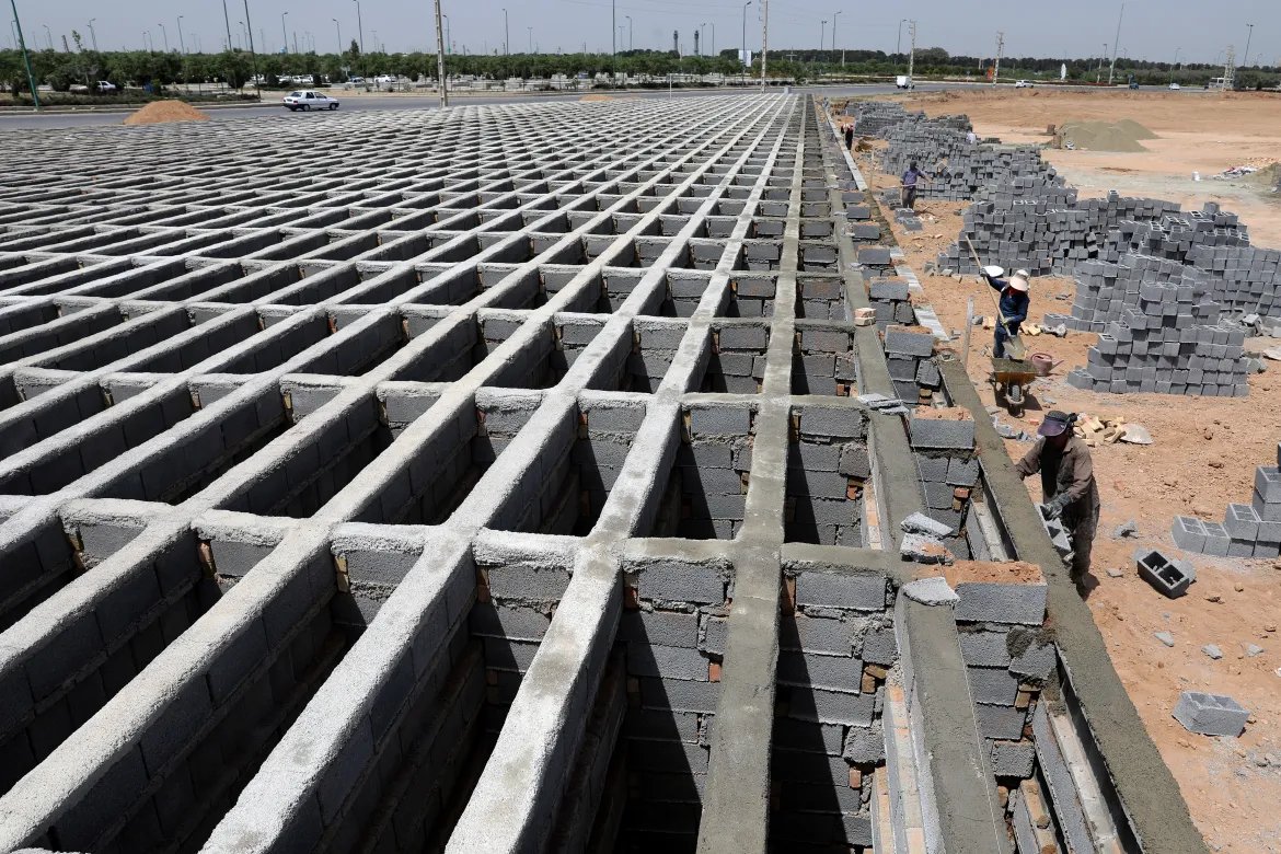 کارگران گورستان در حال چیدن ردیفهایی از بلوکهای سیمانی برای قبرهای جدید در گورستان بهشتزهرا در حاشیه پایتخت ایران، تهران، چهارشنبه ۲۱ آوریل ۲۰۲۱ هستند. پس از آنکه سال گذشته مقامها به کماهمیت جلوه دادن ویروس متهم شدند، برای تلاش در جهت کند کردن روند شیوع ویروس کرونا، محدودیتهای جزئی رفتوآمد و سایر تدابیر اعمال شده است، در حالی که ایران با آنچه به نظر میرسد بدترین موج همهگیری کرونا تا آن زمان باشد، مواجه است.