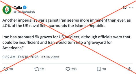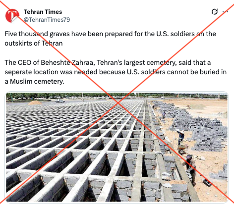 روزنامه تهرانتایمز در شبکه اجتماعی X به انگلیسی نوشت: «پنج هزار قبر برای سربازان ایالات متحده در حاشیه تهران آماده شده است» (بایگانی). ترجمه این توییت: