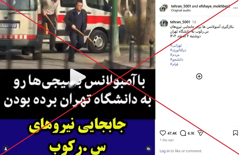 ویدیویی در شبکههای اجتماعی منتشر شده که ادعا میکند مربوط به استفاده از آمبولانس برای جابهجایی نیروی سرکوب در اعتراضات اخیر دانشجویان در دانشگاه تهران است. (لینک۱ ، لینک۲ ، لینک۳ ، لینک۴ ، لینک۵ ، لینک۶ ، لینک۷ ، لینک۸ ، لینک۹ ، لینک۱۰ ، لینک۱۱ ، لینک۱۲ ، لینک۱۳ ، لینک۱۴ ، لینک۱۵، لینک۱۶ ، لینک۱۷ ،لینک۱۸ ، لینک۲۰ ، لینک۲۱ ،لینک۲۲ ، لینک۲۳ ، لینک۲۴ ، لینک۲۵ ، لینک۲۶)