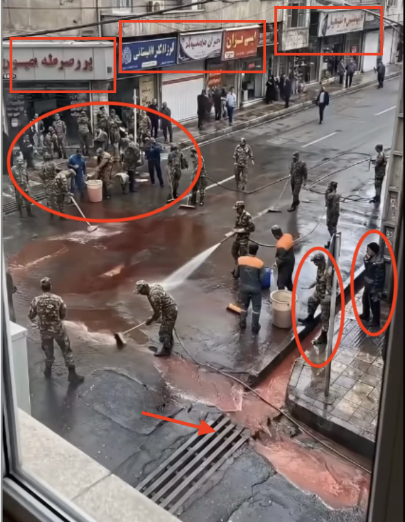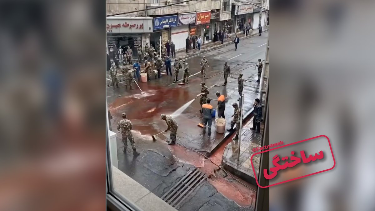 در چند روز گذشته، عکسی به سرعت در شبکههای مجازی مانند اینستاگرام و ایکس بازنشر میشود که در آن عدهای که بیشترشان لباس نظامی بر تن دارند مشغول شستن آسفالت خیابان هستند که به وضوح خونین است (لینک ۱، لینک ۲، لینک ۳، لینک ۴، لینک ۵، لینک ۶، لینک ۷).