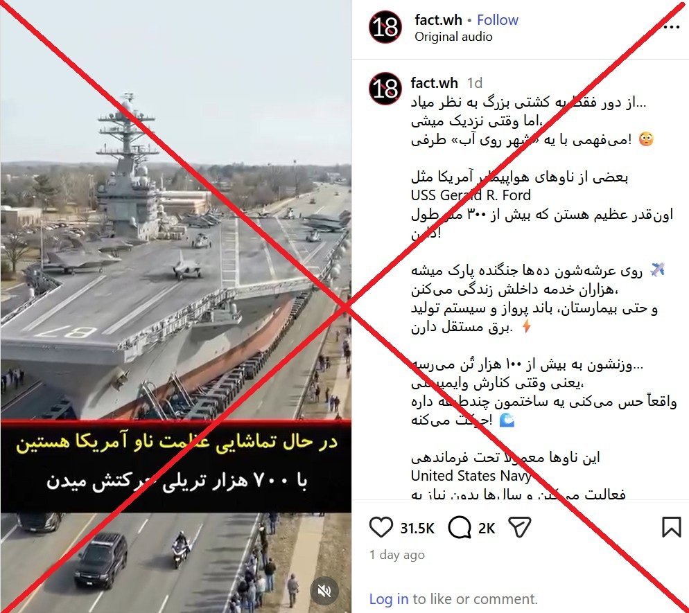 ویدیویی در شبکههای اجتماعی منتشر شده که ادعا میکند مربوط به حمل ناو هواپیمابر جرالد فورد ارتش آمریکا در یک اتوبان است. (لینک۱ ، لینک۲ ، لینک۳ ، لینک۴ ، لینک۵ ، لینک۶)