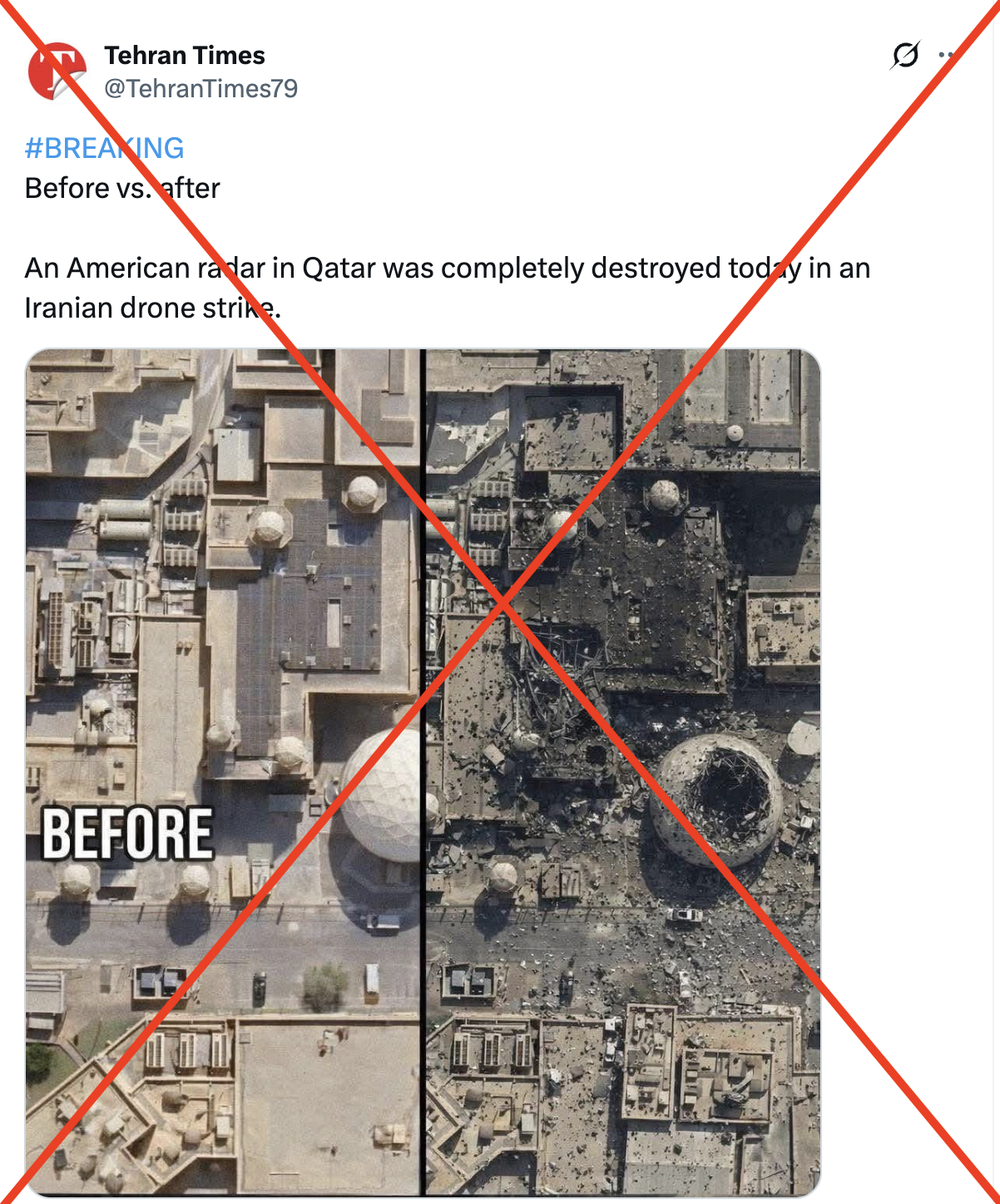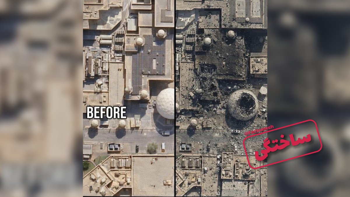 از این رو تصویری که ادعا میشود تصویر منتشر شده از تخریب رادار آمریکایی در قطر است نادرست و ساخته هوش مصنوعی است.