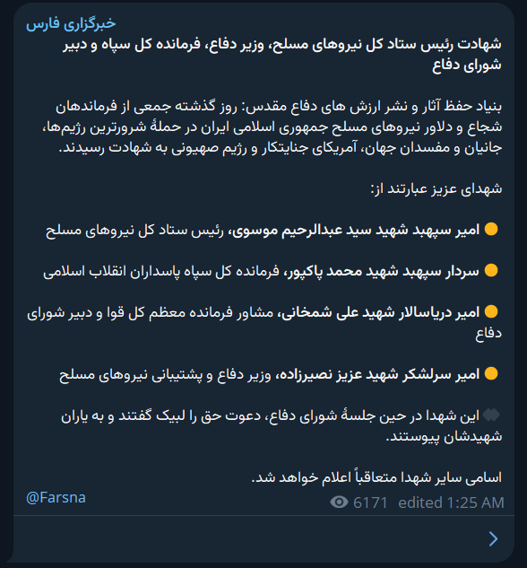 بیانیه سخنگوی فارسی زبان ارتش اسرائیل، سرهنگ دوم کمال پنحاسی، درباره به هلاکت رسیدن رهبر جمهوری اسلامی، علی خامنهای به پیوست تقدیم می گردد: pic.twitter.com/Mn2SG80CVo