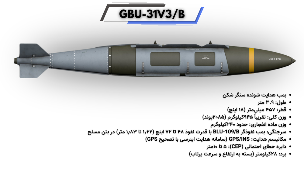 نیروی هوایی اسرائیل بارها از بمب GBU-31V3/B در عملیات های نظامی اخیر بر علیه پناهگاه های زیرزمینی استفاده کرده است. این بمب از سرجنگی نفوذگر BLU-109 بهره می برد که به عنوان یکی از پرمصرفترین تسلیحات سنگرشکن در زرادخانه آمریکا و متحدانش شناخته می شود. این بمب توسط جنگندههای F-15I رَعَم نیروی هوایی اسرائیل در عملیات «نظم جدید» (Operation New Order) علیه پناهگاه زیرزمینی سید حسن نصرالله، رهبر وقت حزبالله لبنان به کار رفته است. تصویر زیر یک جنگنده ضربتی F-15I رعم نیروی هوایی اسرائیل متعلق به اسکادران ۶۹ام معروف به «چکشها» را نشان میدهد.