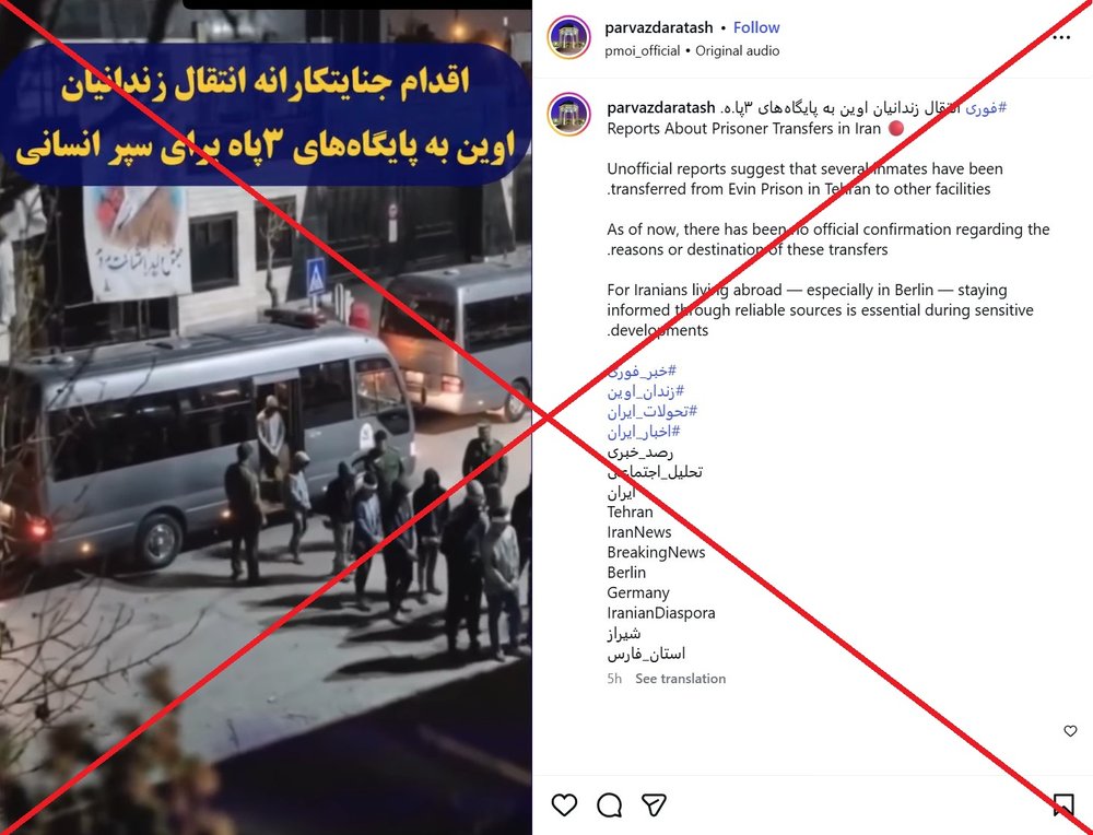براساس این ادعا گروهی از زندانیان از زندان اوین یا زندانهای دیگر، از زندان خارج میشوند تا به پایگاههای سپاه منتقل شوند و در آنجا به عنوان «سپر انسانی» مورد استفاده قرار گیرند. این مطلب که صدها بار بازنشر شده به یک ویدیو استناد میکند. شبکه ایران اینترنشنال نیز این ویدیو را در شبکههای اجتماعی خود منتشر کرده که احتمالا منجر به باورپذیری آن شده است.