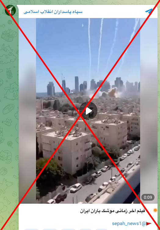 در تلگرام سپاه پاسداران ویدیویی با عنوان «فیلم آخر زمانی موشک باران ایران» منتشر شده.این طور نشان داده میشود که ویدیو از پنجره ساختمانی گرفته شده که یک پرچم اسرائیل هم در آن قرار دارد و احتمالا منظور بمباران شدن اسرائیل با موشکهای ایرانی است.