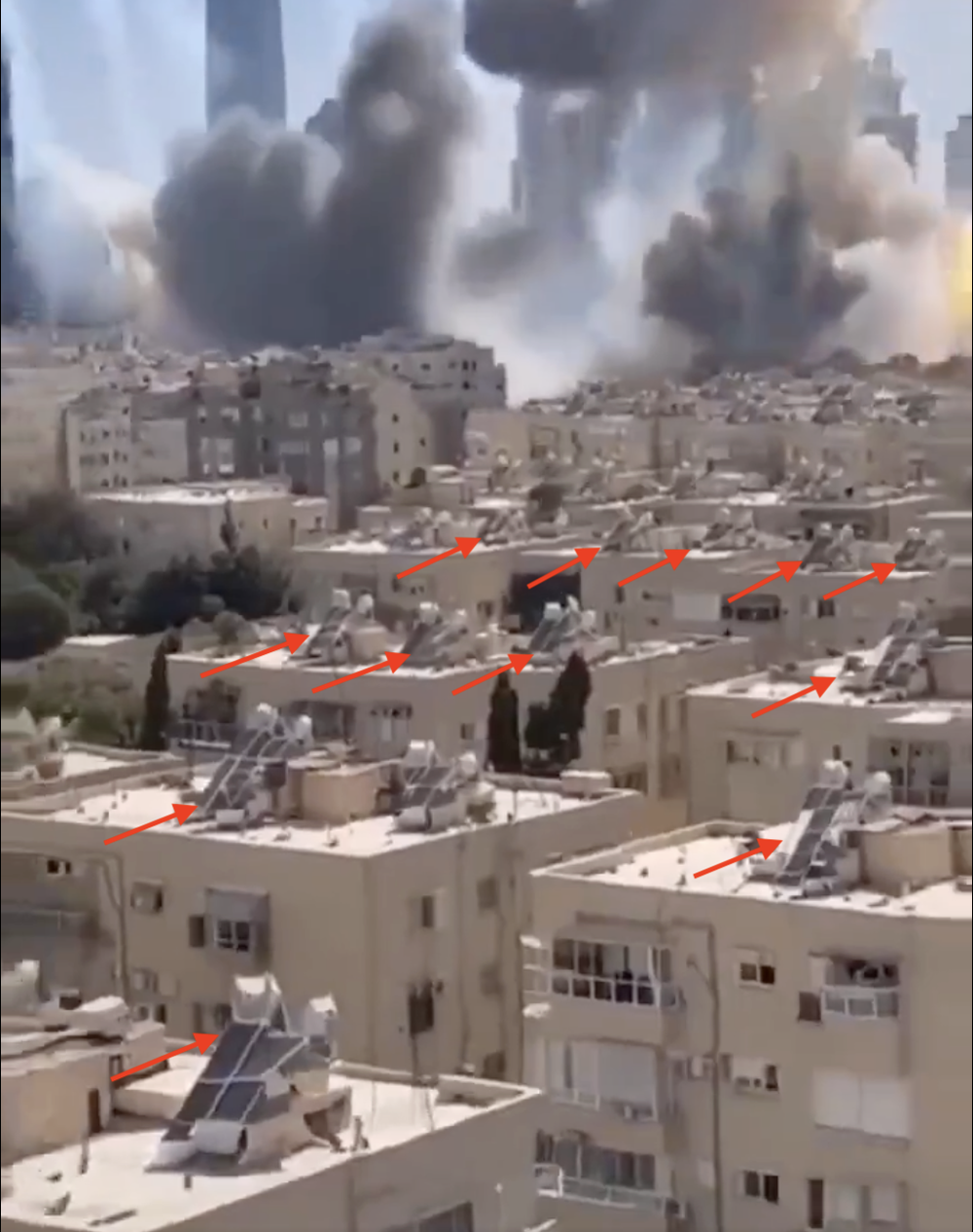 پشت بام همه خانهها کاملا به هم شبیهند و به نظر می رسد با تکرار یک الگو ساخته شدهاند. هیچ نشانهای از این ویدیو در خبرگزاریهای رسمی و معتبر دیده نمیشود و میتوان آن را بخشی از جریان تولید ویدیوها و تصاویر جعلی در جریان حملات نظامی این روزها دانست.