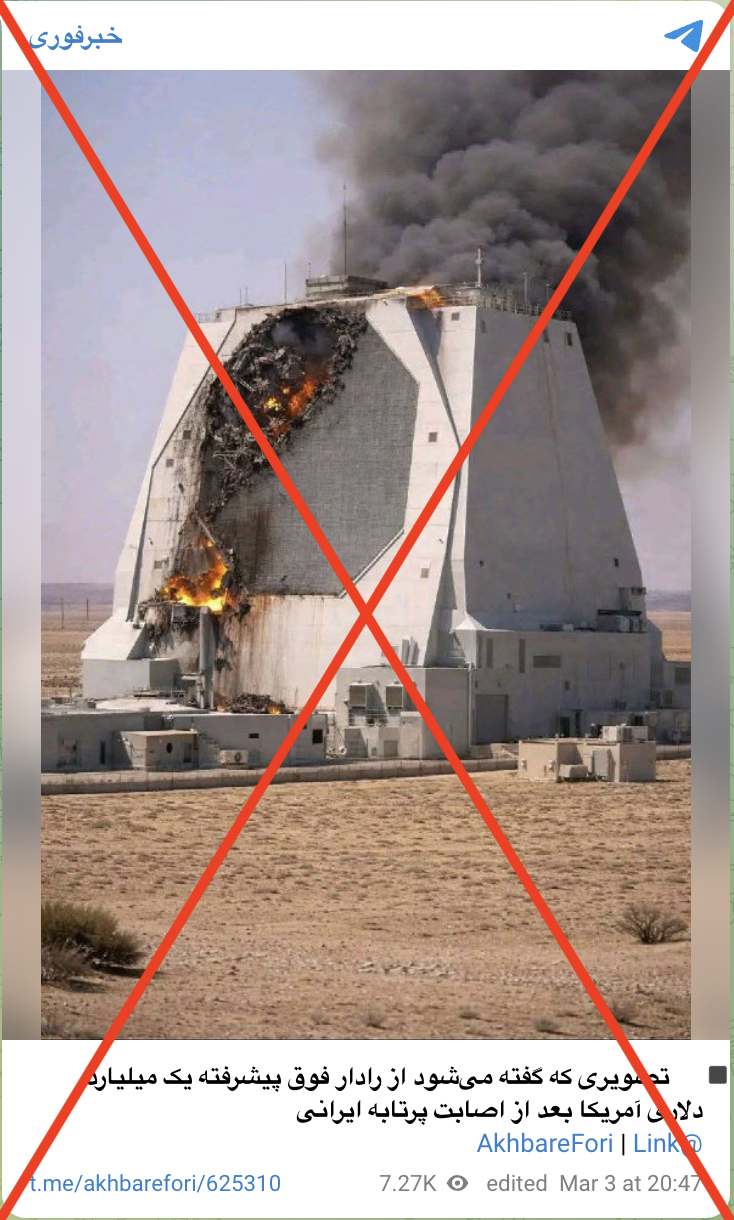 این تصویر پیش از این ابتدا در تاریخ ۳ مارس ۲۰۲۶ در حساب X ألأحداث ألإيرانية بالعربية منتشر و بعد حذف شد (بایگانی). ادعا این است که این عکس رادار آمریکایی AN/FPS-132 را در قطر نشان میدهد که مورد حمله پرتابههای ایرانی قرار گرفت.