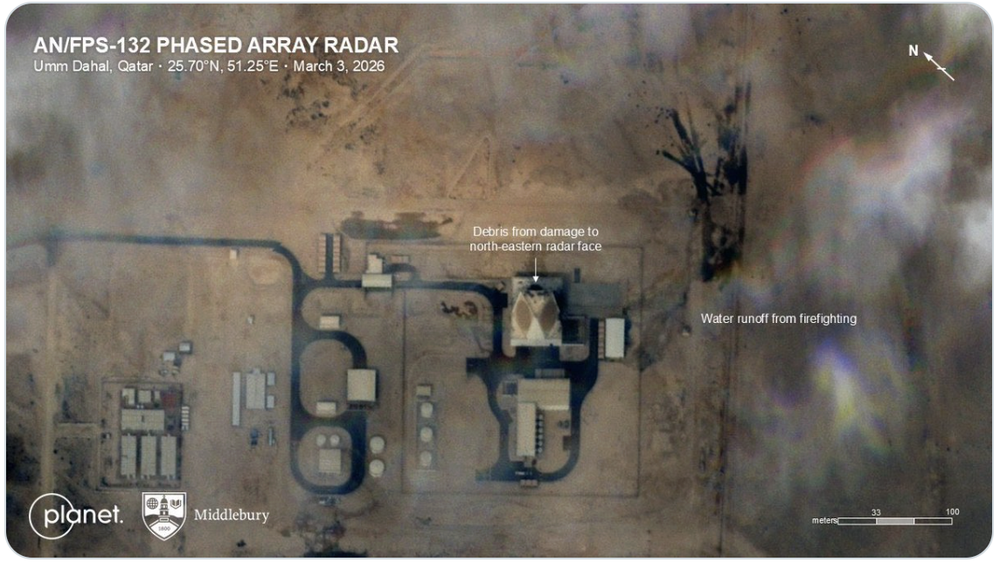 امروز، ۱۳ اسفند ۱۴۰۴ تصاویر ماهوارهای شرکت Planet Labs بخشی از ادعاهای مطرحشده طی چند روز گذشته از سوی جمهوری اسلامی ایران را تایید کرد (SOAR). کارشناسان میگویند این تصاویر نشان میدهد یک پهپاد انتحاری ایرانی یا پرتابهای دیگر توانسته با موفقیت به سامانه رادار هشدار زودهنگام موشکهای بالستیک AN/FPS-132 (Block 5) متعلق به نیروی فضایی آمریکا در قطر اصابت کرده و خسارت وارد کند. آوار بخش آسیبدیده روی سقف ساختمان اصلی که رادار روی آن قرار دارد ریخته و آثار جاری شدن آب ناشی از عملیات اطفای حریق نیز دیده میشود.