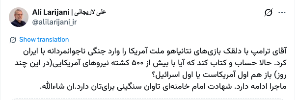 همزمان با ادامه درگیریهای نظامی ارتش آمریکا-اسرائیل و جمهوری اسلامی، حساب کاربری علی لاریجانی، دبیر شورای عالی امنیت ملی و مشاور رهبر پیشین جمهوری اسلامی در x (توییتر سابق) ادعا کرد در این چند روز ۵۰۰ نفر از نیروهای آمریکایی کشته شدهاند:
