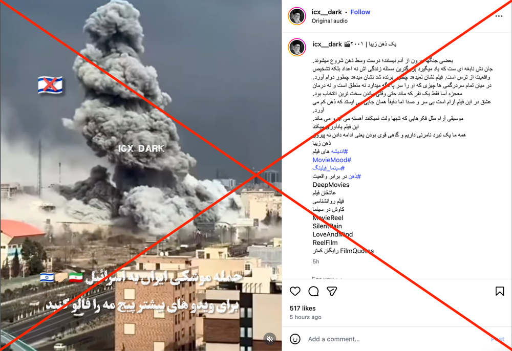 در چند روز گذشته در شبکههای اجتماعی به ویژه اینستاگرام ویدیوهای متفاوت بسیاری منتشر شده که تصاویری از آوار، برخورد موشک، سوختن خانهها در آتش نشان میدهد و ادعا میشود مربوط به اسرائیل است و در پی حملههای جمهوری اسلامی ایران به وجود آمدهاند (لینک ۱، لینک ۲، لینک ۳، لینک ۴، لینک ۵).