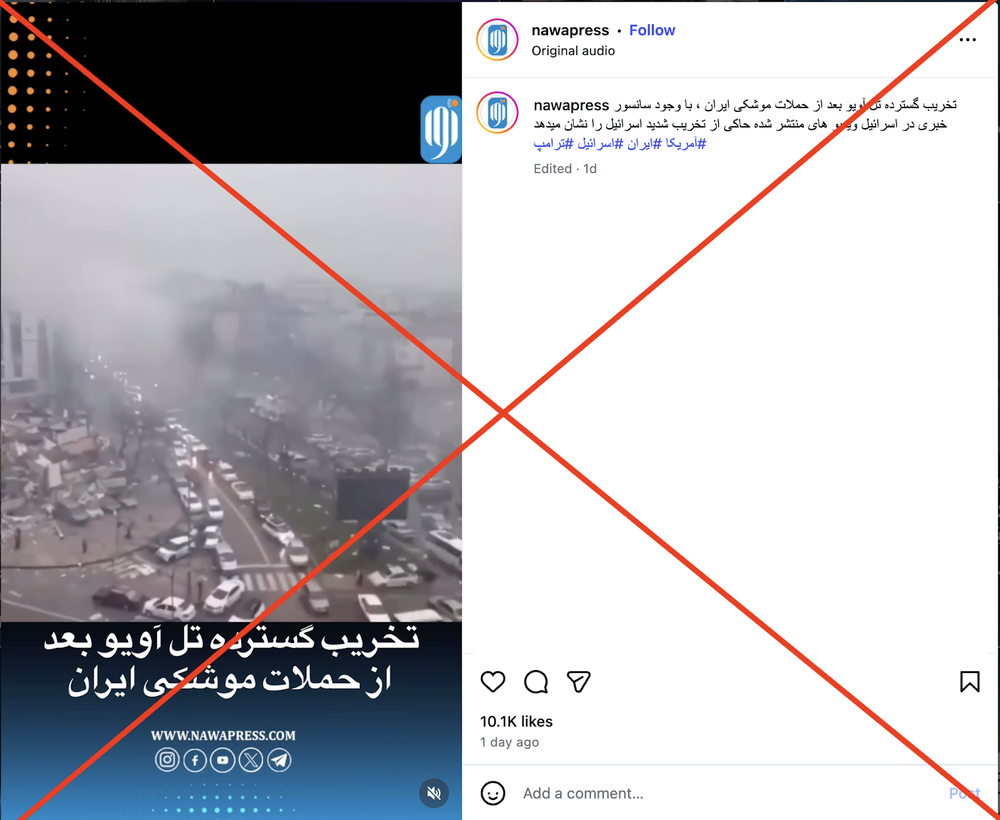 یک ویدیوی دیگر که به دفعات بازنشر شده شهری را از بالا نشان میدهد که بخشی از آن تخریب شده و ماشینها زیر آوار هستند. ادعا میشود ویدیو شهر تلآویو را نشان میدهد که بر اثر حملات ایران تخریب شده است.