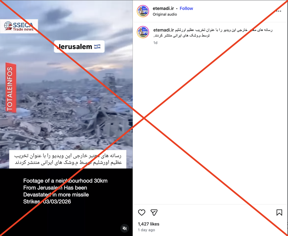 ویدیوی دیگری که در این باره منتشر شده نمای گستردهای از فضای شهری را نشان میدهد که به طور کامل تخریب شده است. در توضیحات این ویدیو ادعا شده است که «رسانههای معتبر خارجی این ویدیو را با عنوان تخریب عظیم اورشلیم توسط موشکهای ایرانی منتشر کردند».
