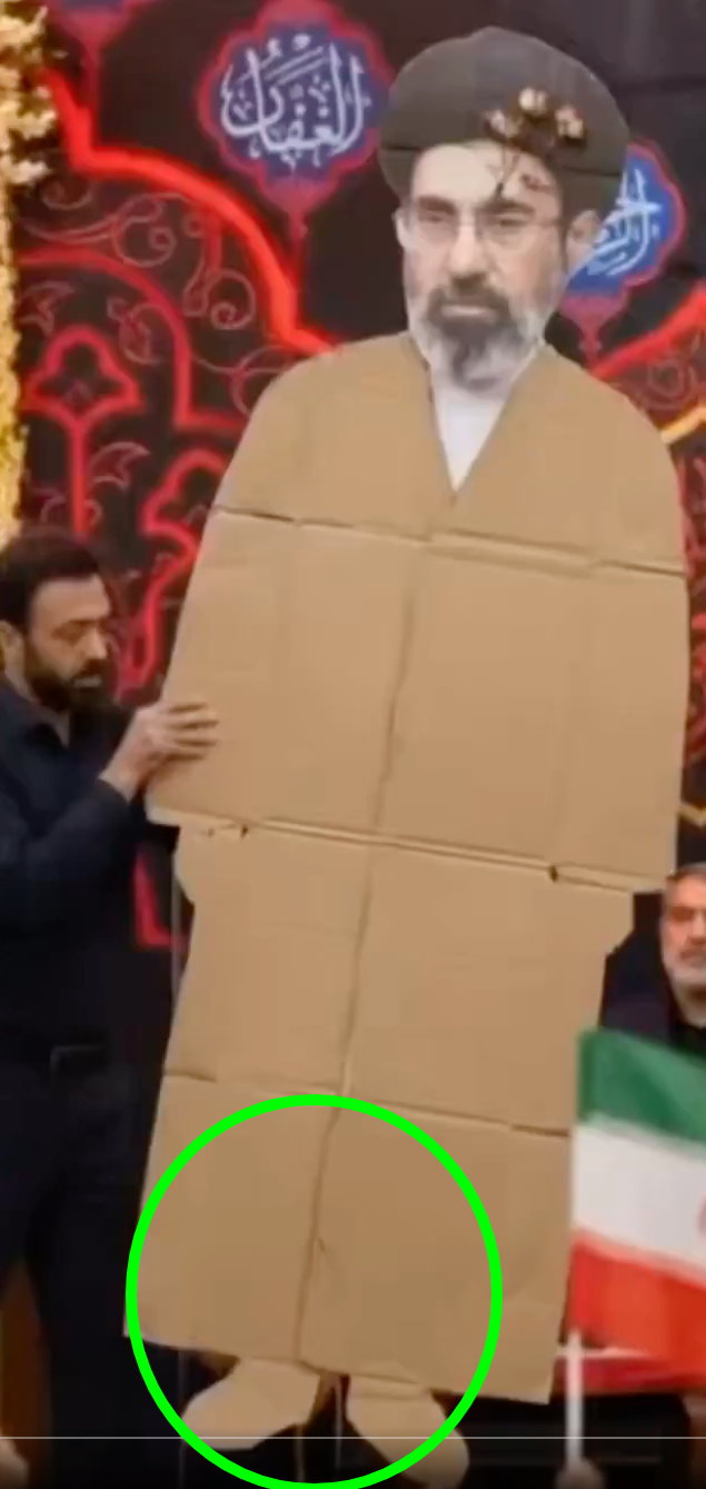یکی از ویدیوهایی که بارها در شبکههای اجتماعی بازنشر شده، تصاویری را نشان میدهد که در آن به نظر میرسد فردی یک ماکت مقوایی از مجتبی خامنهای را جلوی جمعیت رونمایی میکند.