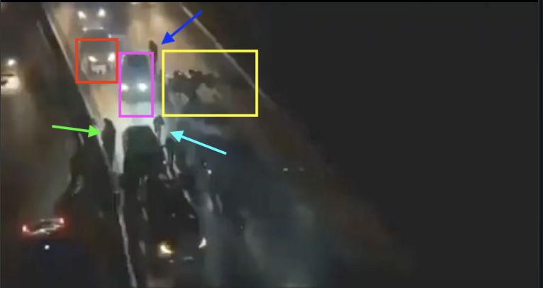 ویدیو اصلی طولانیتر است و صف بلندی از ماشینها را نشان میدهد که مجبور به توقف و تردد از بین ماشین و موتورهایی هستند که خیابان را بستهاند و در آن میان صدای تیراندازی شنیده میشود.