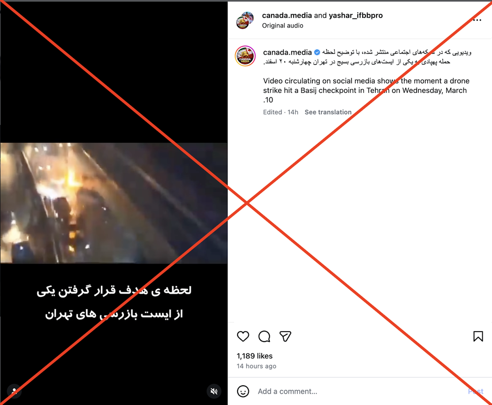 در توضیح این ویدیو نوشته شده که مربوط به لحظهای هدف قرار گرفتن یکی از ایستهای بازرسی بسیج تهران در روز چهارشنبه ۲۰ اسفند ماه است.