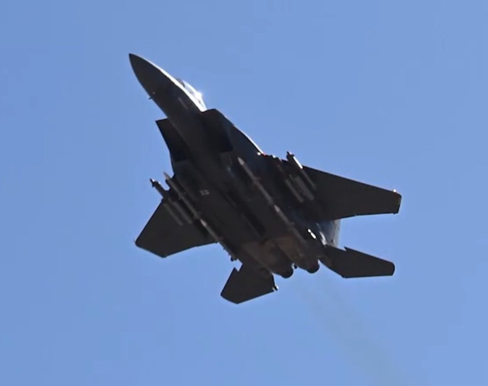 عکس بالا: تسلیحات جنگنده F-15E استرایک ایگل نیروی هوایی آمریکا که مسلح به چهار تیر موشک AIM-9X، چهار تیر موشک AIM-120C/D آمرام و چهار غلاف هفت تایی راکت هدایت لیزری AGR-20F FALCO در جریان عملیات خشم حماسی است که نشان میدهند هدفش مقابله با پهپادهاست.