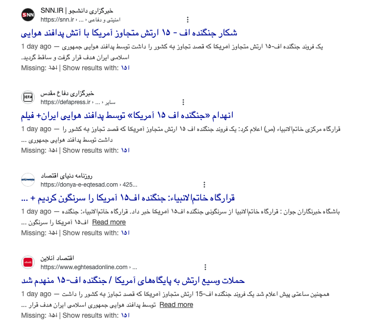 روایتهای منتشرشده در رسانههای حکومتی و شبکههای اجتماعی عمدتا به حادثه کویت مرتبط هستند و هیچ مدرک مستقلی از سرنگونی F-15 در ایران ارائه نشده است.