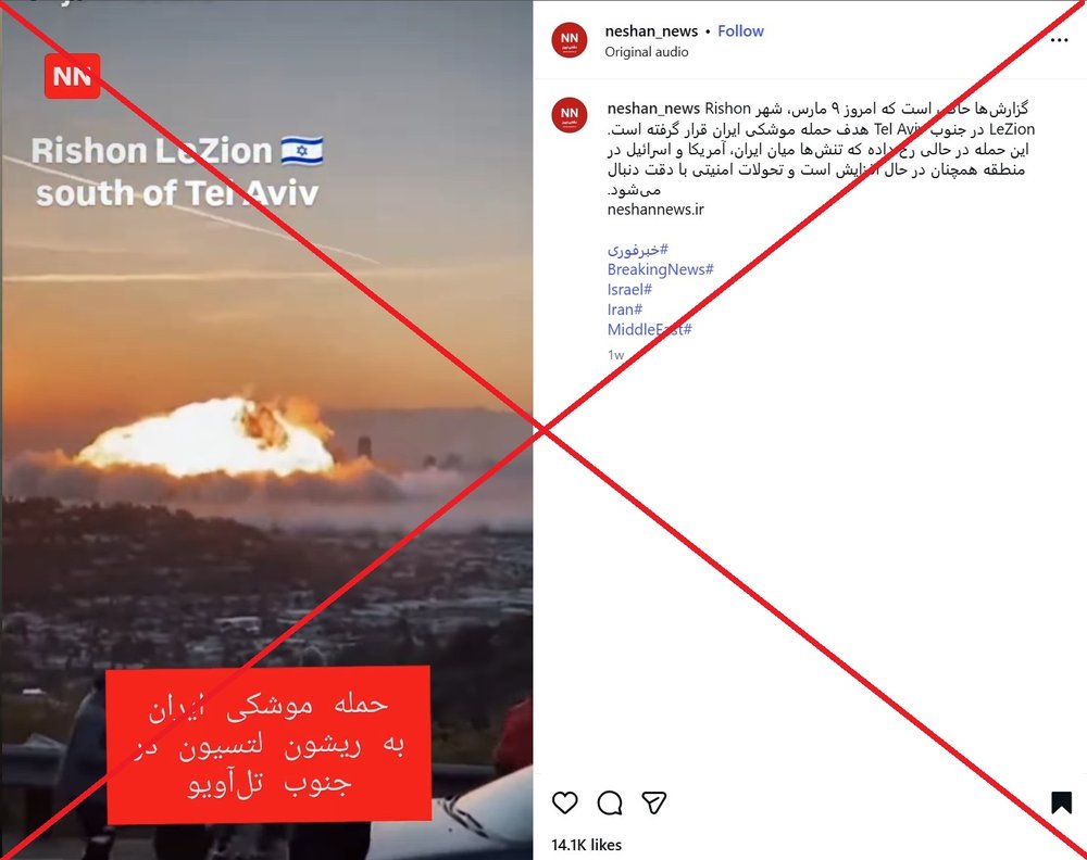 شواهد آشکاری نشان میدهند که این ویدیو جعلی است و ارتباطی با حمله موشکی جمهوری اسلامی به منطقه ریشون لتسیون ندارد.