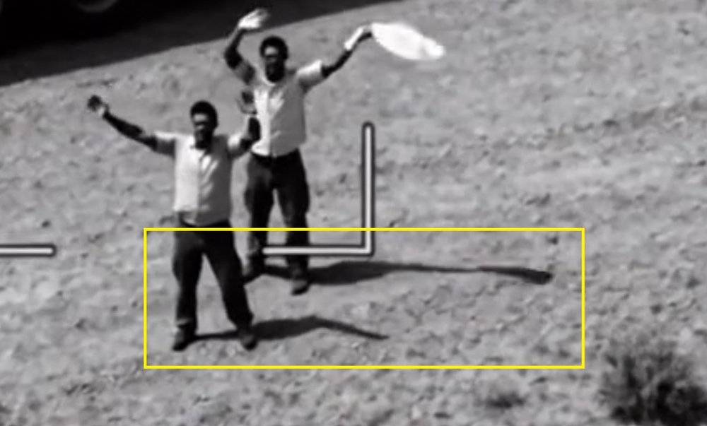 سایه این دو مرد که در ویدیو ادعا شده در برابر «پهپادهای آمریکا اسرائیل» تسلیم شدهاند، شباهتی به سایه آنها یا انسانی که ایستاده باشد ندارد.