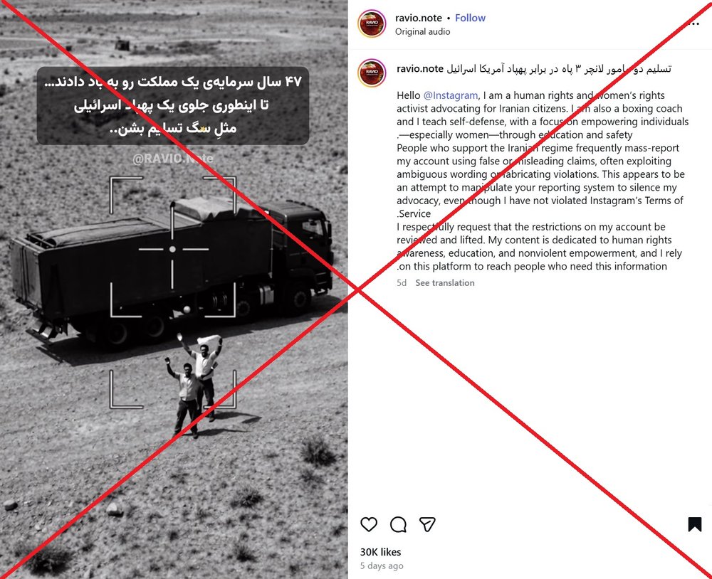 ویدیویی در شبکههای اجتماعی منتشر شده که ادعا میکند مربوط به صحنه تسلیم دو اپراتور لانچر موشک سپاه در برابر پهپادهای آمریکا یا اسرائیل است. (لینک۱ ، لینک۲ ، لینک۳ ، لینک۴ ، لینک۵)