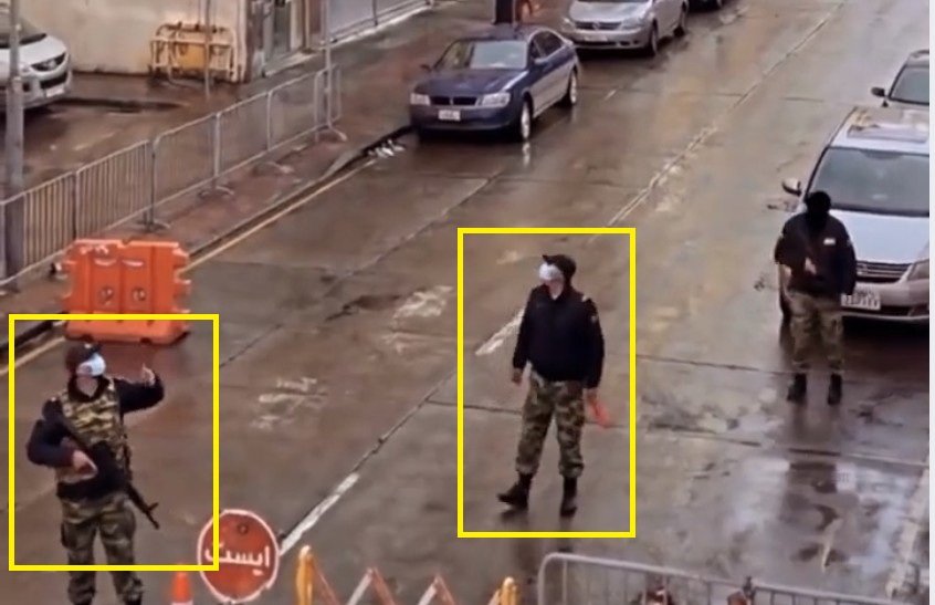 در ابتدای ویدیو مامور سمت چپ، بر خلاف ماموری که در وسط ایستاده، سلاحی در دست ندارد. اما با گذشت چند ثانیه، سلاحی شبیه یک مسلسل در دستان مامور سمت چپ ظاهر، و دستان مامور میانی خالی میشود: