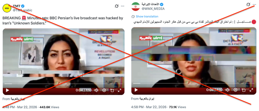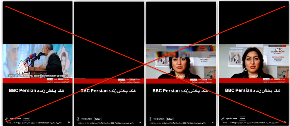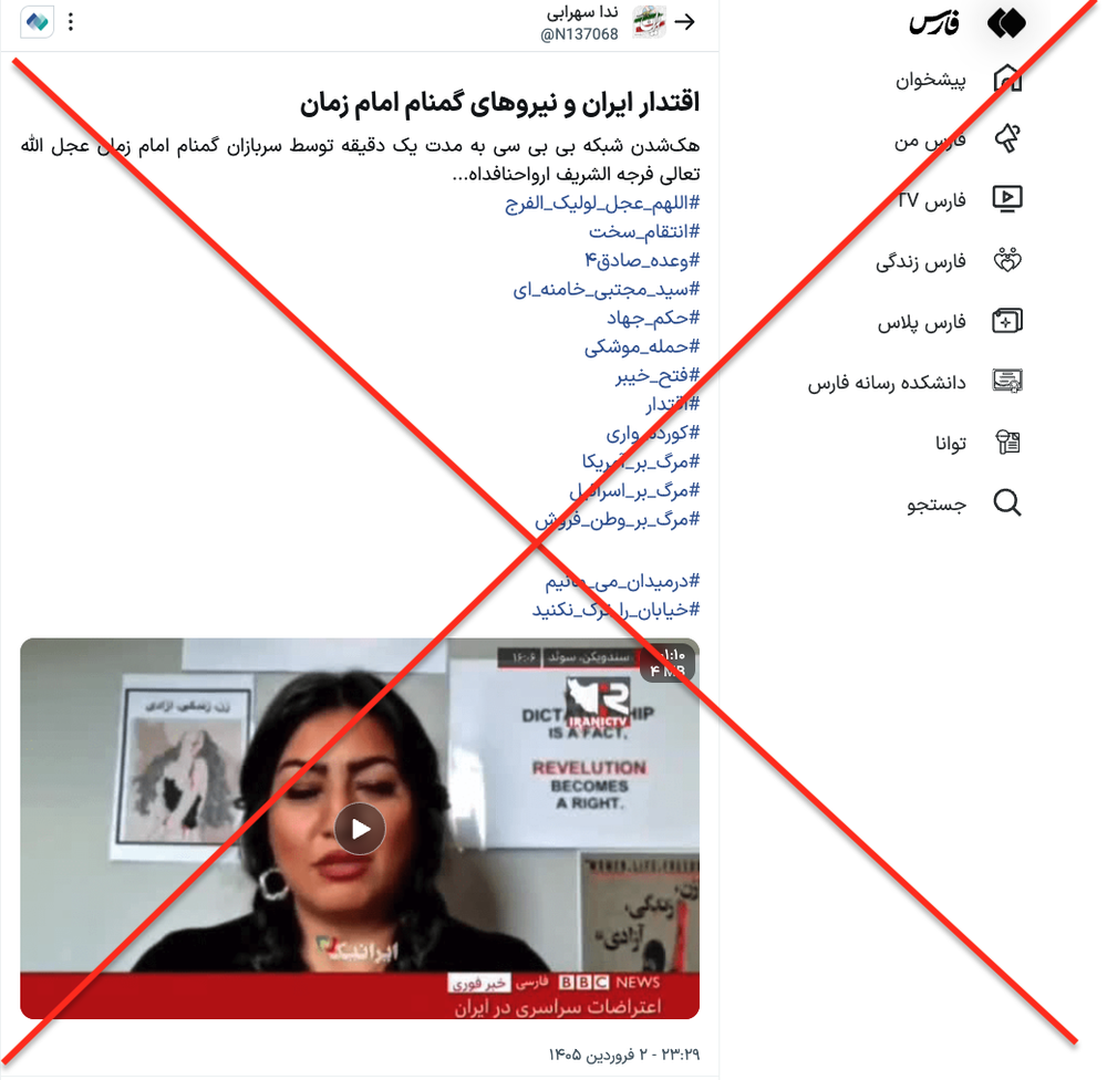 این ویدیو اما ساختگی و خبر هک شدن بیبیسی فارسی جعلی است. چنانکه از محتوای و نشانههای داخل تصویر پیدا است، این ویدیو ربطی به روزهای اخیر ندارد. زیر ویدیو کپشن «اعتراضات سراسری در ایران» نوشته شده است و کارشناس برنامه (مهدیه گلرو) درباره «حجاب» صحبت میکند. بنابراین روشن است که به جنگ اخیر ارتباطی ندارد.