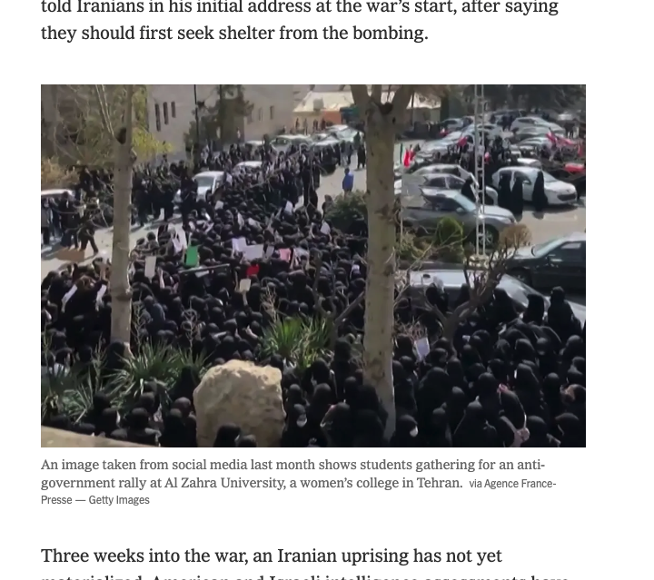 در این مقاله گفته شده رئیس موساد به نتانیاهو و دولت ترامپ طرحی ارائه داده بود که بر اساس آن، حملات هوایی و ترور رهبران ایران در ابتدای جنگ میتوانست به سرعت باعث قیام مردمی و فروپاشی حکومت شود، با این حال، با گذشت سه هفته از آغاز درگیریها، هیچ شورشی شکل نگرفته است. در این مقاله گفته شده ارزیابیهای اطلاعاتی نشان میدهد که حکومت ایران همچنان پابرجاست و ترس مردم از سرکوب از سوی نیروهای نظامی، مانع از شکلگیری اعتراضات شده است. (ترجمه فارسی این مقاله در انتهای این گزارش درستیسنجی آمده است*.)