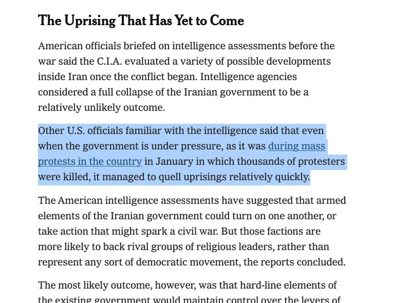 «سایر مقامات آمریکایی مطلع از ارزیابیهای اطلاعاتی گفتند که حتی زمانی که حکومت تحت فشار قرار میگیرد، همانطور که در جریان اعتراضات گسترده ماه ژانویه در کشور که در آن هزاران معترض کشته شدند شاهد بودیم، موفق شده است قیامها را نسبتاً سریع سرکوب کند.»
