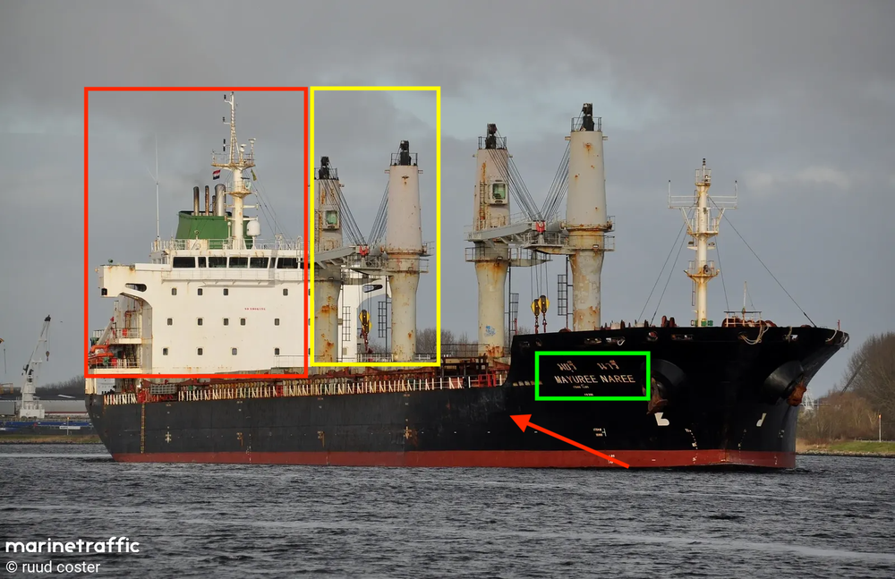 رنگ بدنه کشتی اصلی سیاه است و در ویدیو نادرست رنگ آن آبی است. ساختار پشت کشتی (مربع قرمز) هم با کشتی اصلی منطبق نیست. جرثقیلهای وسط کشتی (ستونهای سفید)، حتی در آنجا که تراکم دود کم است دیده نمیشود (مربع زرد). محل ثبت اسم کشتی در جلوی کشتی با جایی که نام آن در عکس اصلی کشتی نوشته شده منطبق نیست(مربع سبز).
