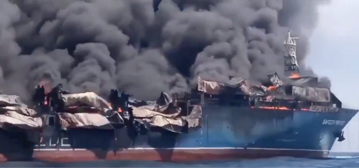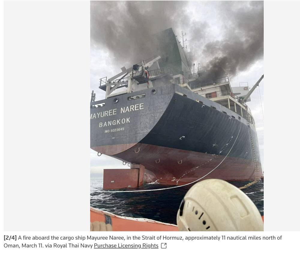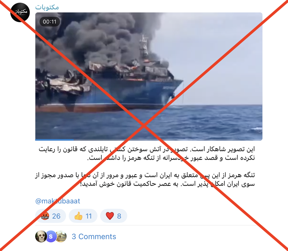 در اکانتهای شبکههای اجتماعی نزدیک به حکومت در ایران ویدیویی منتشر شده که یک کشتی در حال سوختن را نشان میدهد. ادعا شده این یک کشتی تایلندی است «قصد عبور خودسرانه از تنگه هرمز» را داشته و تلویحا ادعا شده که نیروهای ایرانی به آن شلیک کردند. در توضیح این پست آمده: