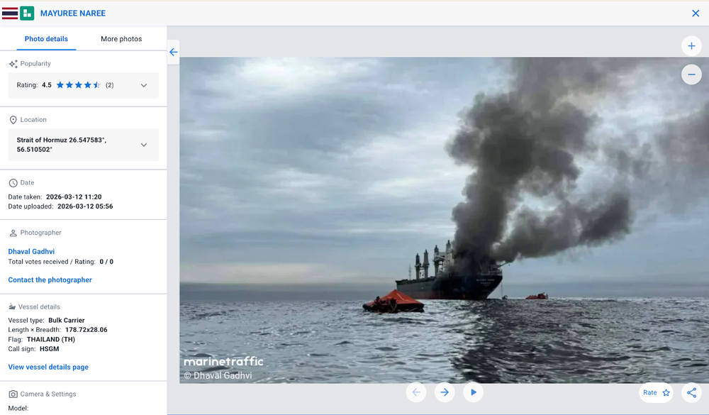 امروز، هفتم فروردین ۱۴۰۵ خبرگزاری تسنیم گزارش داد کشتی تایلندی آسیبدیده در تنگه هرمز، در قشم به گل نشست. بر اساس این گزارش کشتی باری MAYUREE NAREE «مایوره ناره» که حدود دو هفته پیش در تنگه هرمز هدف اصابت موشک قرار گرفته بود، در ساحل روستای رمچاه قشم به گل نشست. این کشتی هم اکنون شمال جزیره لارک و در ساحل جنوبی قشم قرار دارد. در این خبر دو عکس هم از این کشتی منتشر کرد.