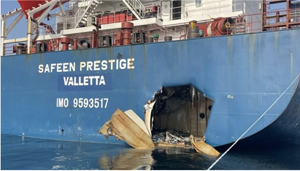 کشتی دیده شده در این ویدئو شباهت زیادی به یک نفتکش آسیبدیده دیگر دارد. کشتی SAFEEN PRESTIGE، یک کشتی کانتینری کوچک با پرچم مالت است که در روز ۱۳ اسفند ۱۴۰۴ (۴ مارس ۲۰۲۶) در تنگه هرمز هدف حمله قرار گرفت.