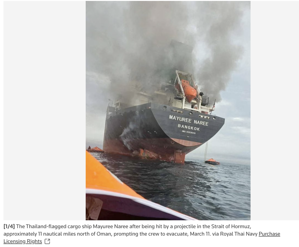 در روز ۱۱ مارس ۲۰۲۶، ۲۰ اسفند ۱۴۰۴ رویترز گزارش داد که دو پرتابه با منشا نامشخص در حالی که کشتی کانتینربر «Mayuree Naree» با پرچم تایلند از تنگه عبور میکرد، به آن اصابت کردند و باعث آتشسوزی و آسیب به موتورخانه شدند. بر اساس این گزارش شرکت بهرهبردار تایلندی کشتی، «Precious Shipping»، در بیانیهای این موضوع را اعلام کرد و گفت: «سه نفر از خدمه مفقود هستند و گمان میرود در موتورخانه گرفتار شده باشند». بر اساس این بیانیه ۲۰ خدمه دیگر با موفقیت تخلیه شده و در عمان به ساحل منتقل شدهاند.
